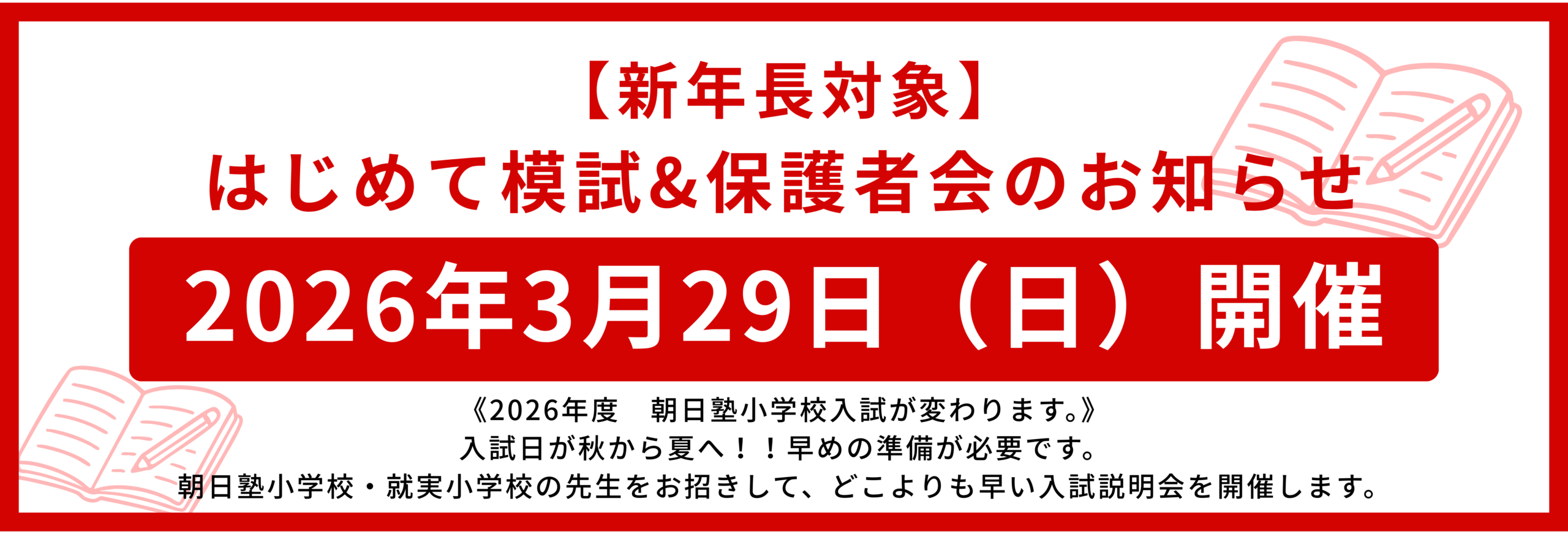 《2026年度 朝日塾小学校入試が変わります》 2026年3月15日 朝日塾宙SOLA 2026年度 朝日塾宙SOLA合格実績 2026年3月6日 朝日塾宙SOLA 【新学年の準備に!】春期講習 受付開始のお知らせ🌸 2026年3月4日 朝日塾宙SOLA 3月無料体験会のお知らせ 2026年3月4日 朝日塾宙SOLA 【新年長対象】はじめて模試&保護者会のお知らせ 2026年3月4日 朝日塾宙SOLA 保護者会&無料体験会のお知らせ 2025年12月18日 朝日塾宙SOLA 早期英才教育講座(年長) 2025年12月12日 朝日塾宙SOLA 早期英才教育講座(年中) 2025年12月12日 朝日塾宙SOLA 【小学4年生(3教科)】冬期講習の案内 2025年11月28日 朝日塾宙SOLA 【小学5年生(適性)】冬期講習のお知らせ 2025年11月25日 朝日塾宙SOLA 1 2 3 4 次へ»
